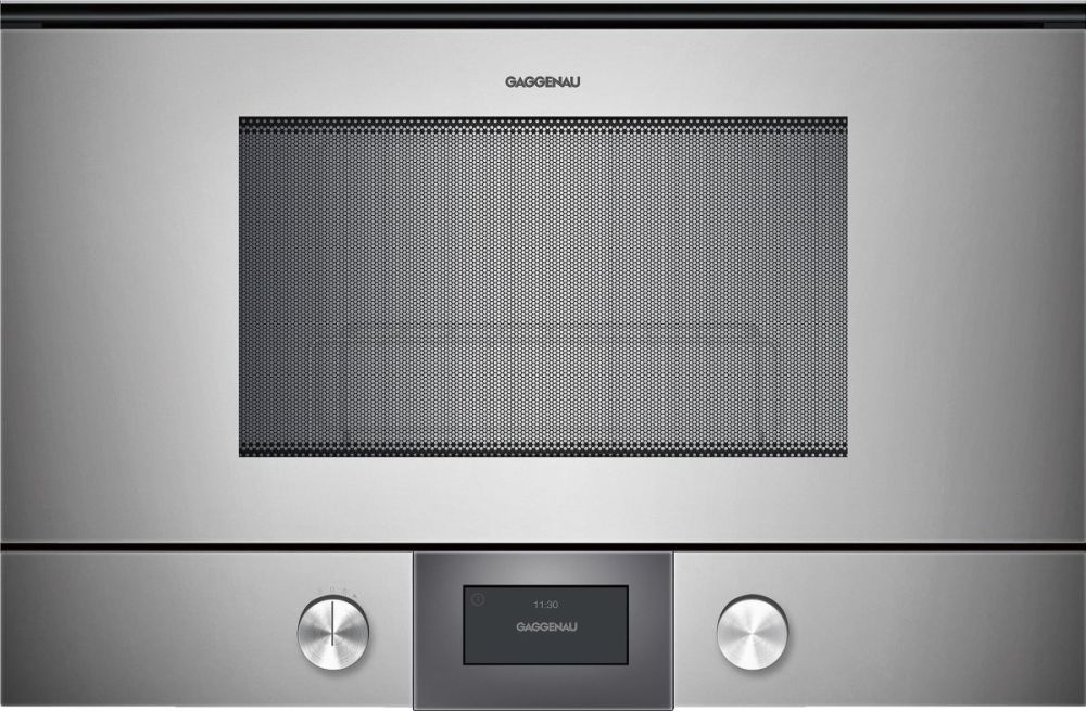 Микроволновая печь Gaggenau BMP224 - отличное подспорье на кухне, которое будет еще и прекрасно смотреться в гарнитуре рядом с остальными приборами Gaggenau. Максимальная мощность микроволн в приборе достигает 900 Ватт. Внутренняя камера выполнена из нержавеющей стали и имеет объем 21 литр. Прибор имеет 5 режимов приготовления, а так же несколько автоматических рецептов. Помимо этого в модели BMP224 есть гриль.
