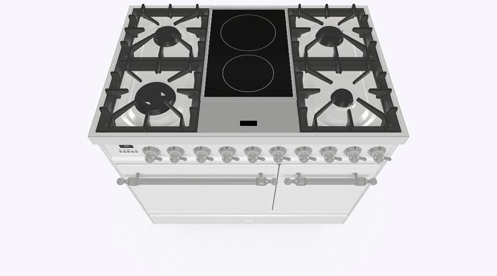 4 газовых, 2 индукционные варочные зоны, двухконторная конфорка DUAL