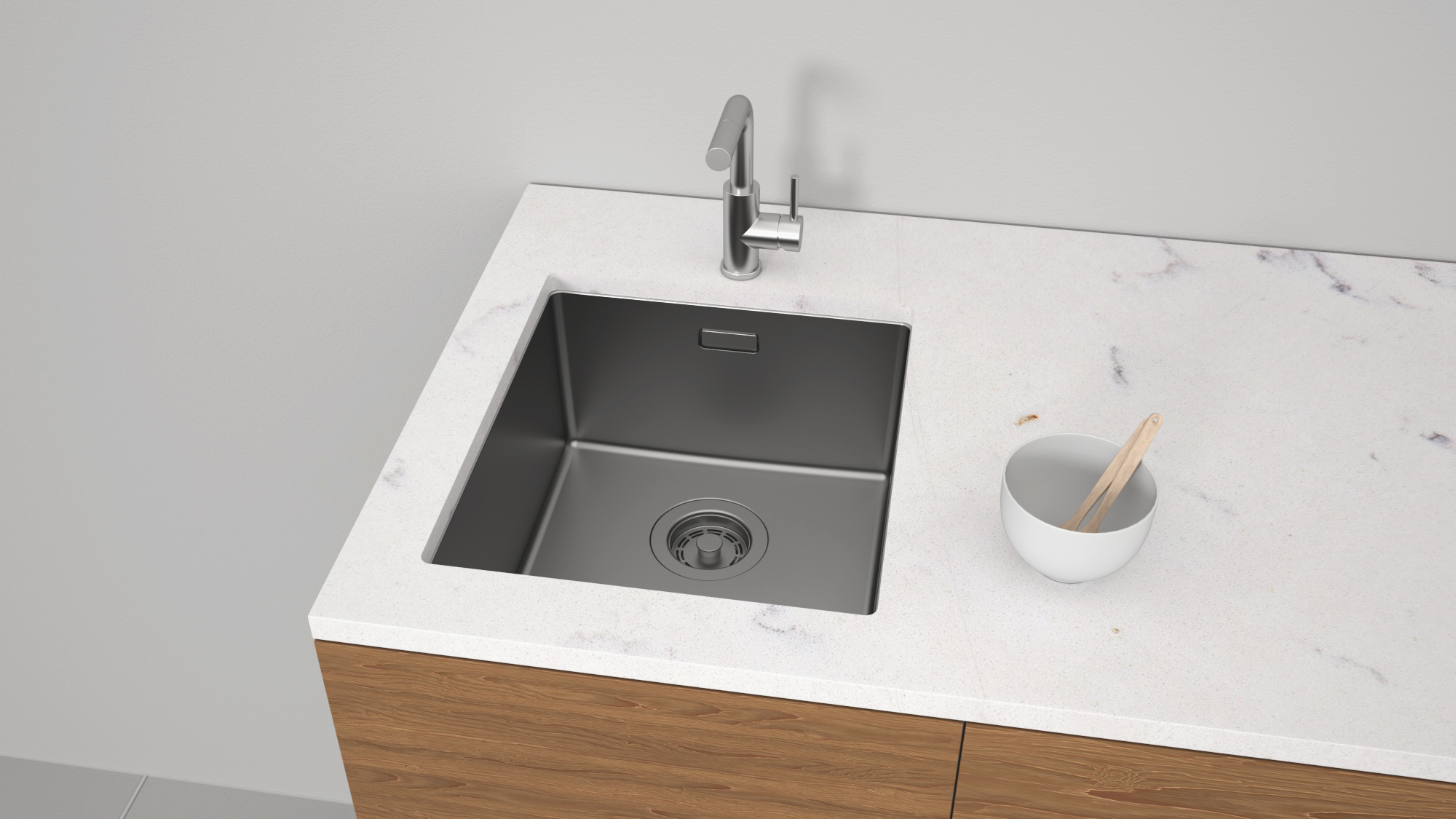 Мойка практически бесшумна под напором струи воды благодаря наличию специальной резиновой накладки снизу мойки, шумопоглощающего покрытия Stille® на внешней стороне чаши и достаточно большой толщине металла 1 мм.