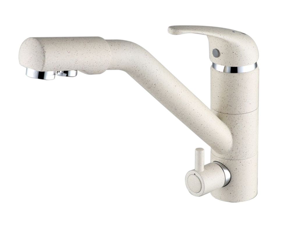 предусматривает поступление фильтрованной воды, которая не смешивается с водопроводной. Питьевая вода подается через отдельные трубку и аэратор, а для регулирования питьевой воды предусмотрена отдельная ручка.