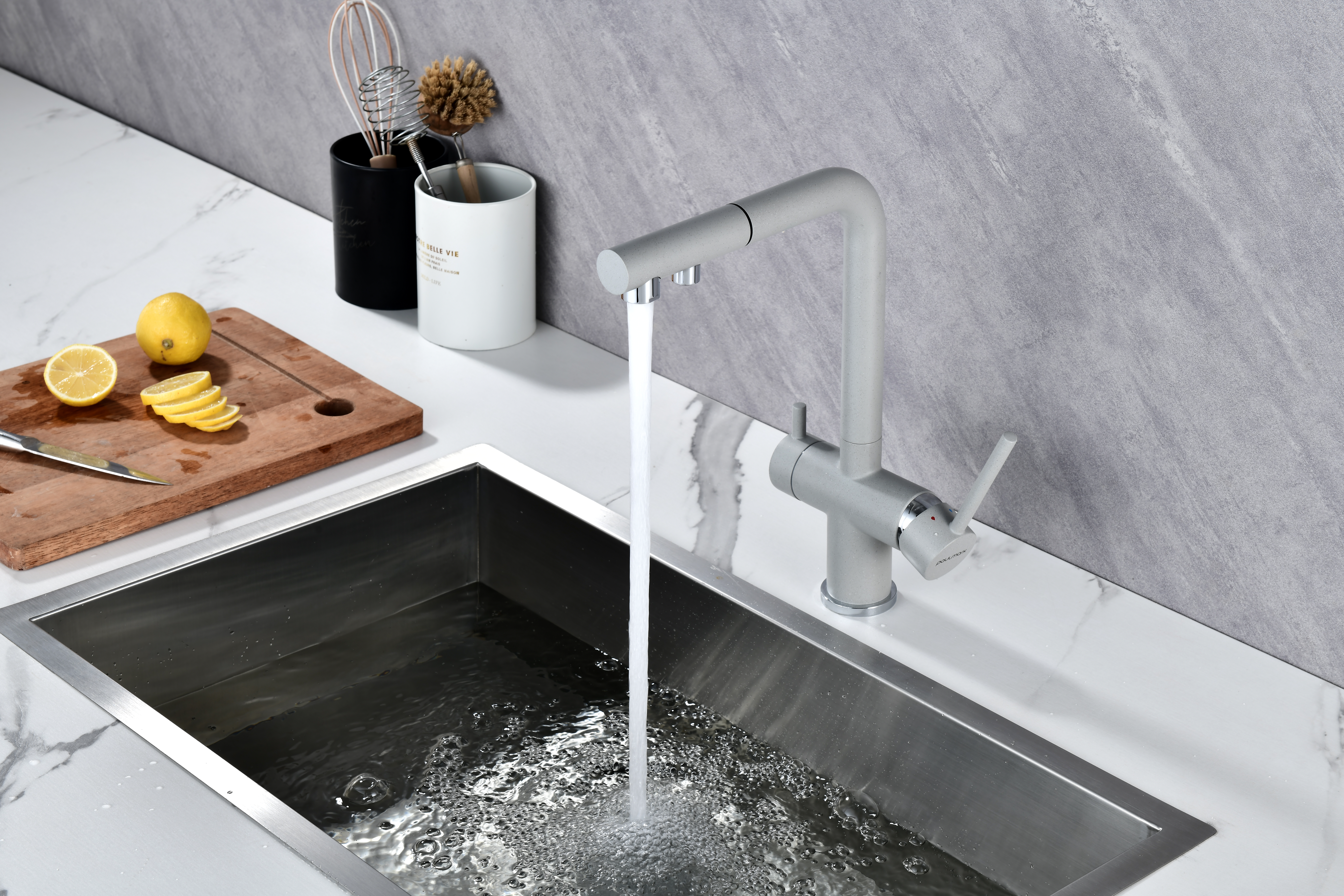 SERPENTINE оснащён функцией TRINKWASSER - излив смесителя имеет встроенный независимый канал для питьевой воды из фильтра, таким образом питьевая и водопроводная вода не смешиваются. Управление питьевой водой осуществляется отдельным рычагом, расположенным слева. Для пуска водопроводной воды используется большой рычаг справа.